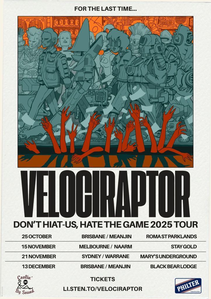 Now, as they begin to embrace their studio-only/4000 shows-only/”too old for this shit” dreams, Velociraptor gear up for their final Australian tour in October through December 2025. Catch them in Brisbane, Sydney, Melbourne – anywhere willing to party with the Velociraptor gang one last time!